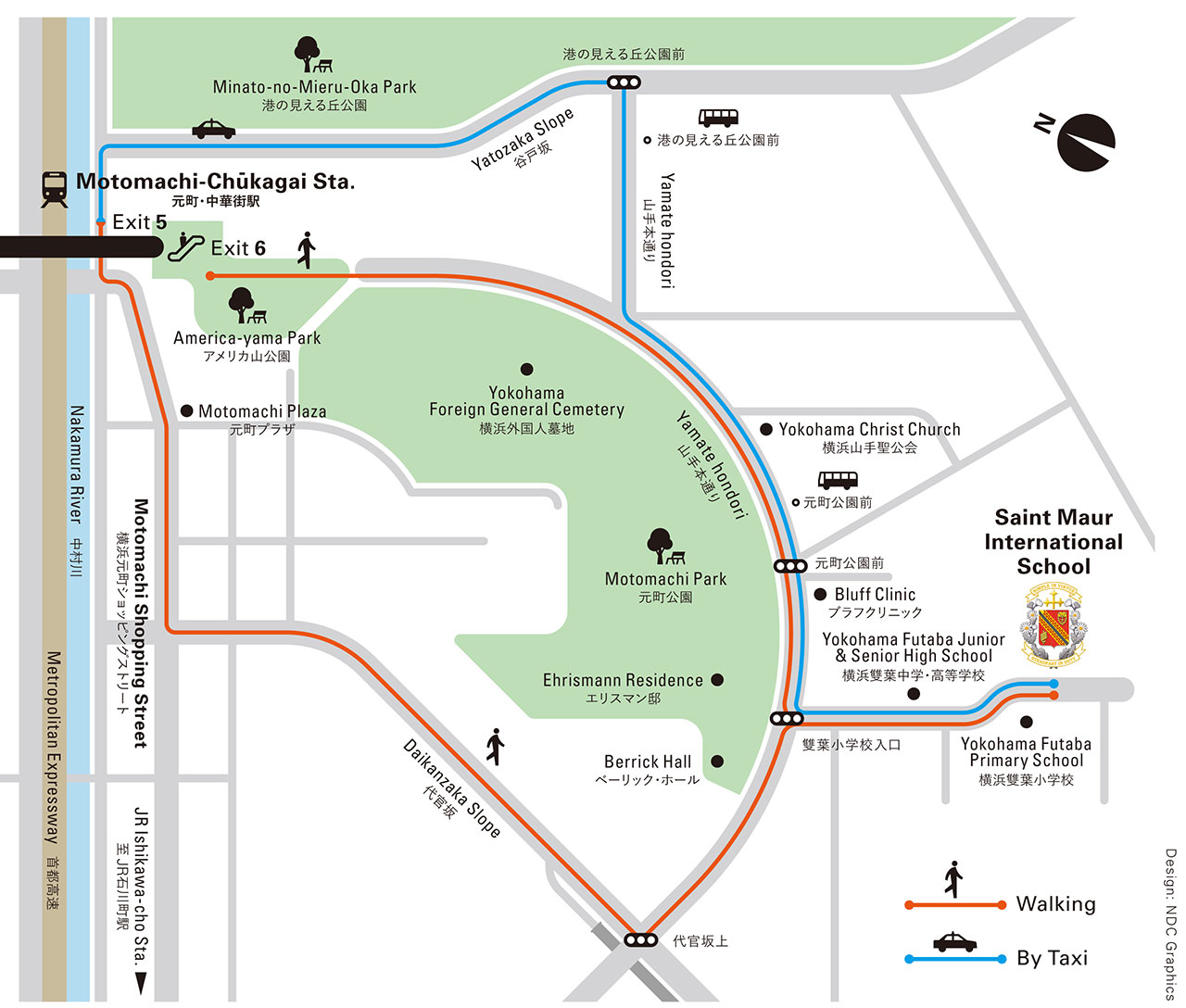 From Motomachi-chukagai station, use the Motomachi Exit to go to America-Yama Park and walk to school (view the itinerary here)